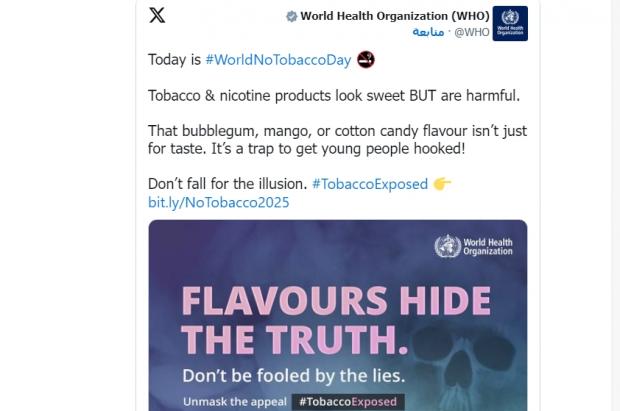وأشارت المنظمة، بمناسبة اليوم العالمي لمكافحة التبغ الذي يأتي في 31 من مايو، إلى أن النكهات مثل المنثول والعلكة وغزل البنات تجعل المنتجات السامة أكثر جاذبية للناشئة، ما يسهل انخراطهم في استخدام هذه المواد، ويزيد من احتمالية إدمانهم عليها.