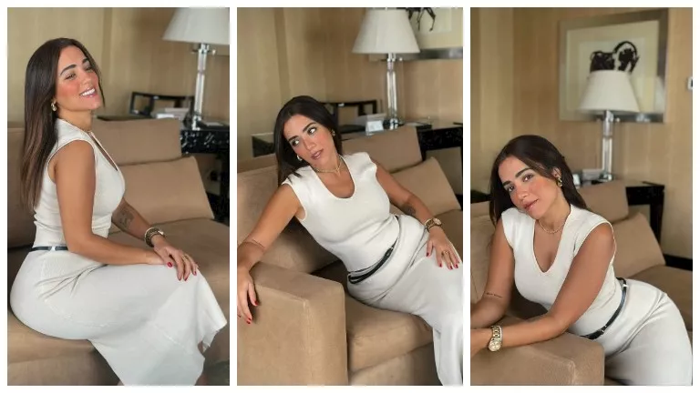 وظهرت آية سليم مرتدية فستان أبيض بدون أكمام،، واعتمدت مكياجًا بسيطًا أبرز ملامحها.