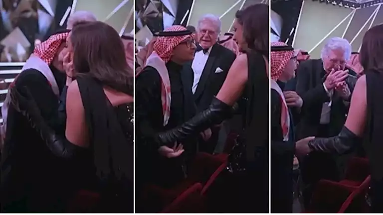 وظهر في الفيديو عبدالمجيد عبدالله وهو يمنح أنغام “قُبلة”، قبل أن يتدخل الفنان حسين فهمي لينقذ الموقف ويعلق ساخرًا: “خلاص خلاص”، لتثير هذه اللقطة جدلًا كبيرًا على مواقع التواصل.