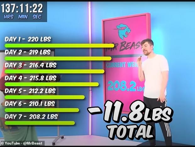 خلال تحدي الصيام الذي استمر لمدة أسبوعين، أظهر وزن “مستر بيست” خلال القياسات اليومية أنه في اليوم الثالث كان قد فقد ما يقارب 4 أرطال، حيث بلغ وزنه 98.2 كجم، ولكن بحلول اليوم السادس، كان وزنه قد انخفض إلى 95.3 كجم، وفي اليوم العاشر وصل إلى 93.5 كجم.