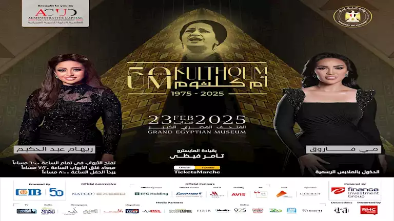 الحفل المقام يوم 23 فبراير المقبل في المتحف المصري الكبير برعاية وزارة الثقافة، وشركة RMC العالمية، تقوم بإحيائه المطربات مي فاروق، وريهام عبد الحكيم، بمشاركة أوركسترا بقيادة المايسترو محمد فيضي.