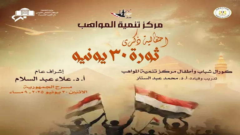تنظم دار الأوبرا المصرية، برئاسة الدكتورة لمياء زايد، احتفالية فنية خاصة بمناسبة الذكرى السنوية لثورة 30 يونيو، وذلك على مسرح الجمهورية.