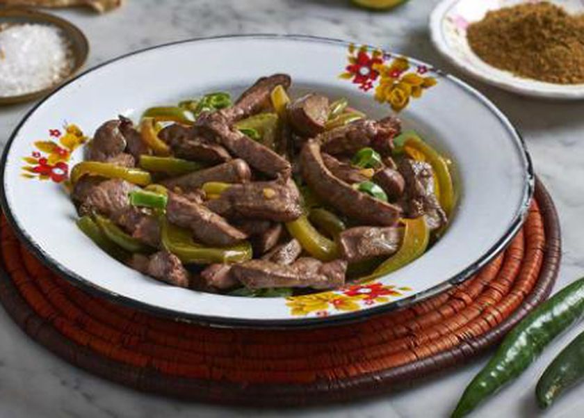 يُضاف الفلفل الحار والملّون، وتُقلب الكبدة لمدة 3 دقائق.