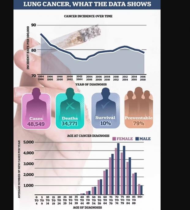تشير بيانات Cancer Research UK إلى أن نسبة الإصابة بسرطان الرئة بين النساء الشابات ارتفعت بنسبة 130% خلال العقود القليلة الماضية، ما يجعلهن الفئة الأسرع نموًا في معدلات الإصابة، رغم أن كبار السن (فوق 70 عامًا) لا يزالون الأكثر عرضة.