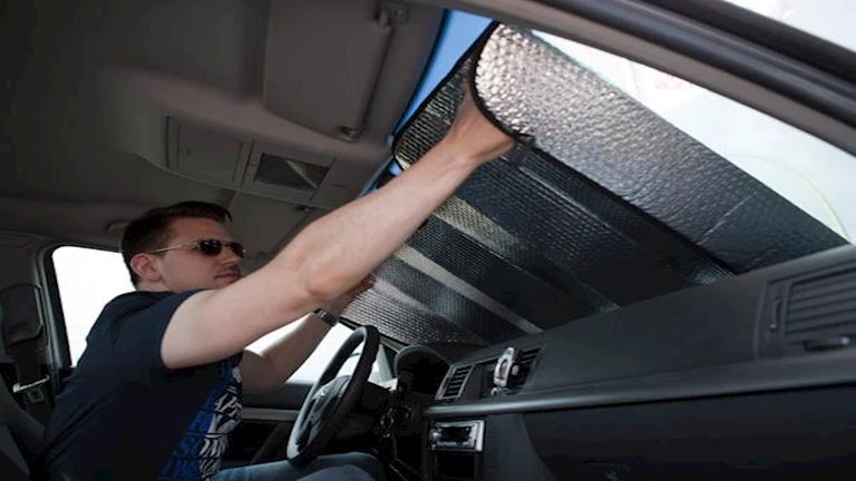المظلات الواقية من الشمس هي من أبسط وأكثر الوسائل فاعلية لتقليل الحرارة داخل السيارة. قم بوضعها على الزجاج الأمامي عند ركن السيارة نهارًا، ويفضل استخدام مظلات مخصصة للزجاج الجانبي والخلفي أيضًا.