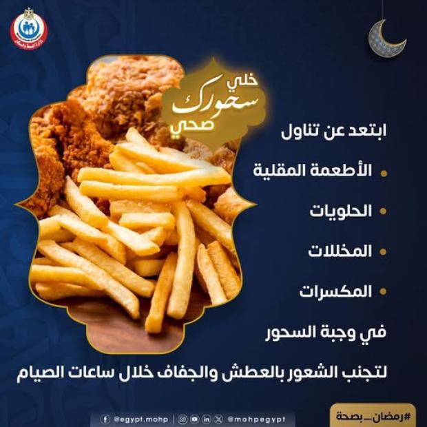 وكانت وزارة الصحة والسكان المصرية، شاركت متابعيها عبر حسابها الرسمي حول الأكلات التي تزيد من الشعور بالعطش والجوع خلال الصيام، على النحو التالي: