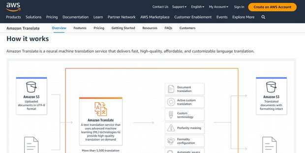 هي خدمة الترجمة الآلية التي تعد جزءًا من Amazon Web Services، فبجانب توفير جميع الأدوات السابقة للتطبيقات وواجهات ترجمة موجهة للمستهلك، فإن Amazon Translate تركز على استخدام واجهة برمجة التطبيقات، وهذا يعني أنه يمكنك استخدامه لترجمة تطبيقك أو موقع الويب الخاص بك، ويدعم Amazon Translate حاليًا أكثر من 75 لغة مختلفة، وهو أقل مما تقدمه Google Translate أو Microsoft Translator، ولكنه أكثر من DeepL.