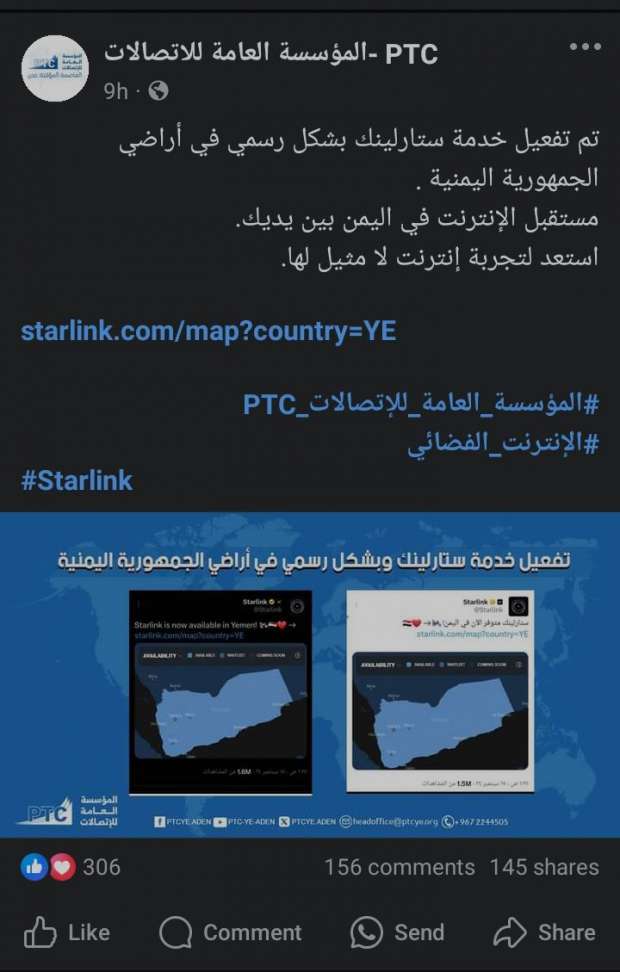 وفي منشور على «فيسبوك»، أعلنت المؤسسة العامة للاتصالات في العاصمة عدن بدء تفعيل خدمة الإنترنت الفضائي «ستارلينك» على أراضيها بشكل رسمي، وقالت: «تم تفعيل خدمة ستارلينك بشكل رسمي في أراضي الجمهورية اليمنية»، وأضافت المؤسسة في بيانها: «مستقبل الإنترنت في اليمن بين يديك، استعد لتجربة إنترنت لا مثيل لها».