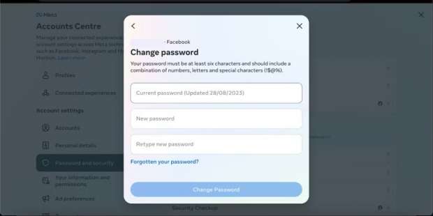 بمجرد إلغاء وصول الشخص غير المصرح له، يتعين عليك اتخاذ خطوات للتأكد من عدم حدوث ذلك مرة أخرى، من خلال تغيير كلمة المرور لحسابك على فيسبوك، ويمكنك فعل ذلك باتباع الخطوات التالية:
