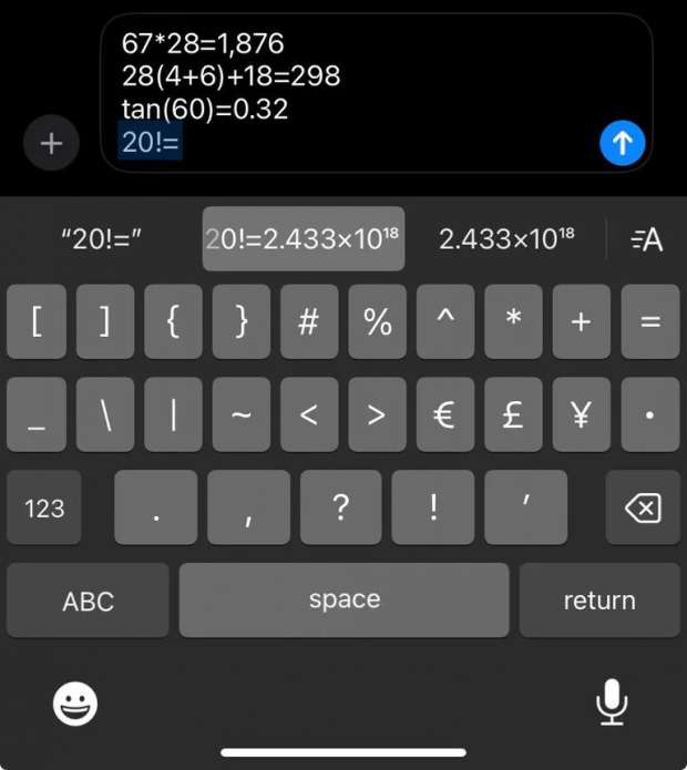 يمكن لتطبيق الرسائل حل المعادلات البسيطة مثل «2+2=»، بالإضافة إلى المعادلات المعقدة التي تتضمن الدوال المثلثية مثل الجيب وجيب التمام والظل، ولكن من الضروري التأكد من تضمين علامة التساوي (=) في نهاية المعادلة.