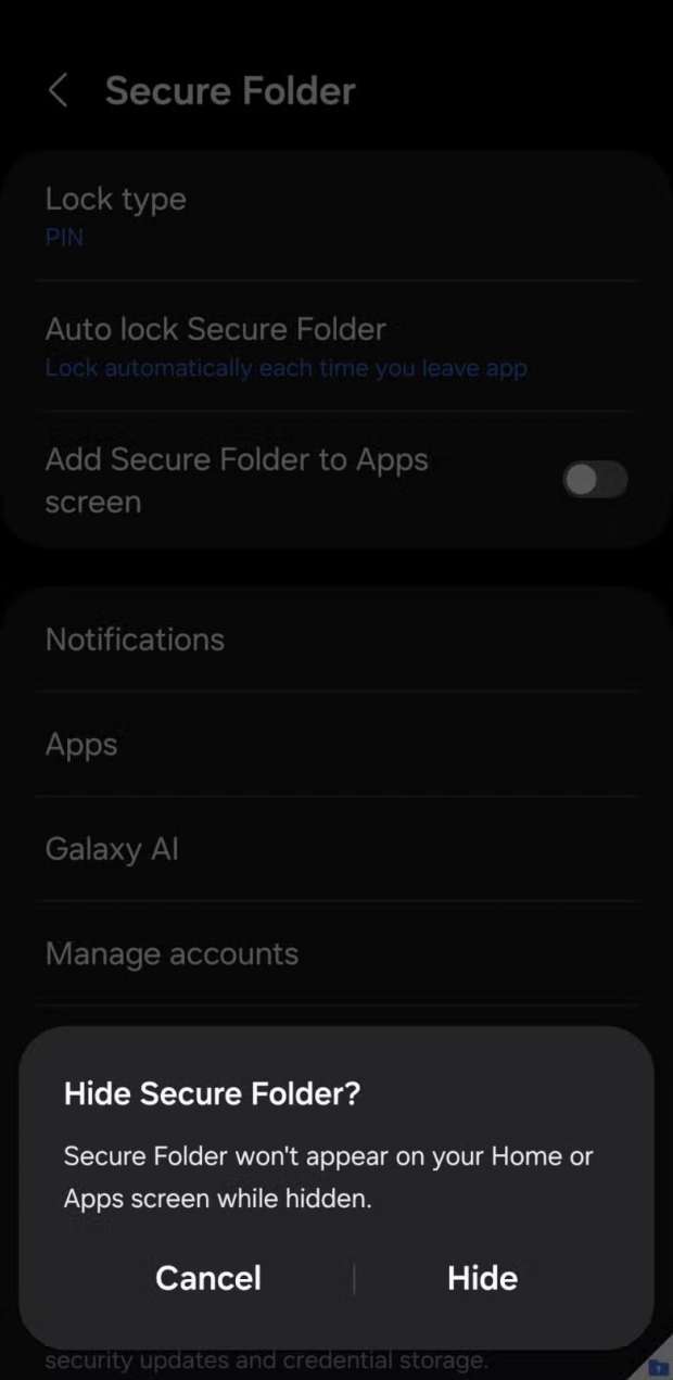 وبحسب موقع «androidpolice» التقني، فيُنشئ Secure Folder ملفاً منفصلاً بمساحة تخزين خاصة، مما يساعد في عزل محتوياته عن بقية الهاتف، ولكن اكتشف مستخدم Reddit lawyerz88 مؤخرًا أنه يمكن الوصول إلى الصور ومقاطع الفيديو المحفوظة في المجلد الآمن Secure Folder من خلال أي تطبيق، وذلك عن طريق تنشيط ملف تعريف العمل، كما يعمل هذا إذا كان لديك ملف تعريف عمل نشط من خلال صاحب العمل أو قمت بتمكينه يدويًا عبر تطبيقات الطرف الثالث.