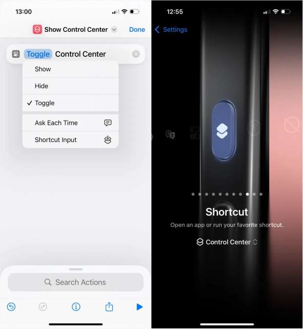هو عبارة عن تخصيص كامل في طرز iPhone 15 Pro و 16، يمكنك تخصيص «زر الإجراء» لأي وظيفة تقريبًا، بما في ذلك فتح مركز التحكم، لكي تقوم بتفعيله اتبع نفس خطوات إنشاء اختصار مخصص لمركز التحكم، ولكن بدلاً من «إظهار»، اختر «تبديل» في الإجراء، ثم انتقل إلى «الإعدادات» ثم «زر الإجراء» واختر الاختصار الذي أنشأته.