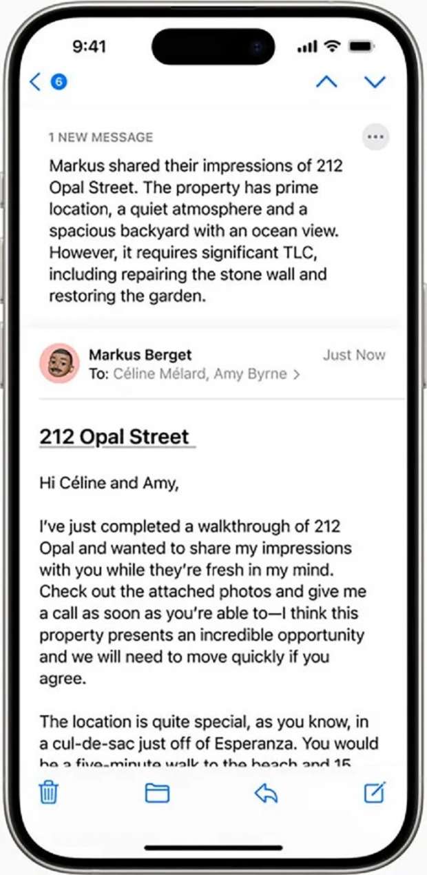 وبحسب الرئيس التنفيذي لأبل، فإن هناك حيلة عبقرية في هواتف آيفون تمكنك التقاط صورة، وإذا كان هناك شخص ثالث في الصورة تفضل عدم التواجد فيه، فيمكنك تنظيف الصورة وإزالة الشخص، كل ما عليك فعله هو النقر على زر التنظيف- Clean Up وسيختفي الشخص غير المرغوب فيه تماما، كما أنه من إحدى حيل Apple Intelligence الجديدة المفضلة هي ميزة توفير الوقت أو ملخصات البريد في تطبيق البريد الإلكتروني، حيث تعمل على تحديد النقاط الرئيسية في البريد الإلكتروني وتلخيصها من بين مئات الرسائل الإلكترونية التي تتلقاها يوميا.