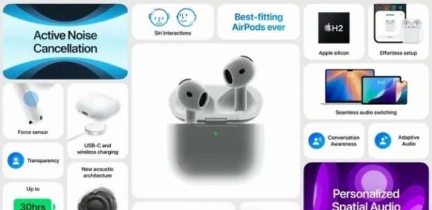 وبحسب شركة أبل، فإن سماعة AirPods 4 مزودة بخاصية إلغاء الضوضاء النشط في تصميم الأذن المفتوحة لأول مرة على الإطلاق، بفضل شريحة H2 والميكروفونات المحدثة، يساعد هذا التصميم على تقليل الضوضاء البيئية منخفضة التردد، مثل محركات الطائرات وأنظمة التدفئة والتهوية وتكييف الهواء وحركة المرور في المدينة قبل أن تصل إلى أذنيك.