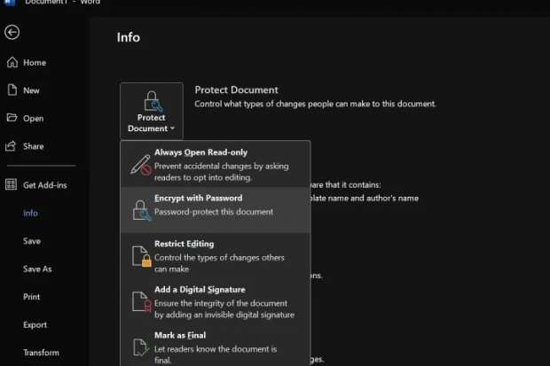 انتقل إلى File، ثم اختار Info، واضغط على Protect Encrypt with Password، وحدد الملف Document، واكتب كلمة مرور، واضغط على موافق، واكتبها مرة أخرى واضغط على موافق لتأكيدها، احفظ الملف، للتأكد من أن كلمة المرور سارية المفعول.