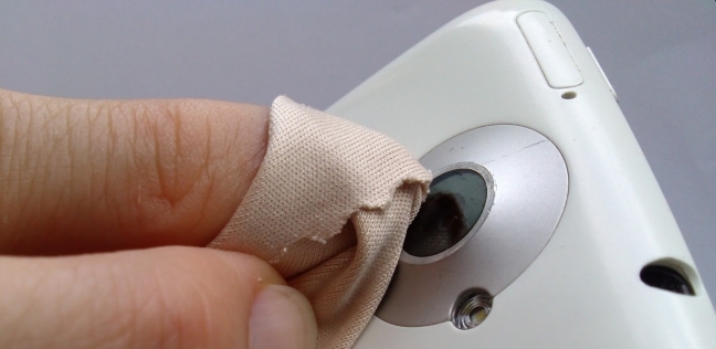 يُعد تنظيف الكاميرا الأمامية أصعب قليلاً من تنظيف العدسة الخلفية، نظرًا لكونها صغيرة جدًا وغائرة قليلاً، ولكن مع ذلك يمكن استخدم زاوية قطعة قماش ملفوفة على شكل مثلث، للوصول إلى داخل فتحة العدسة الصغيرة.