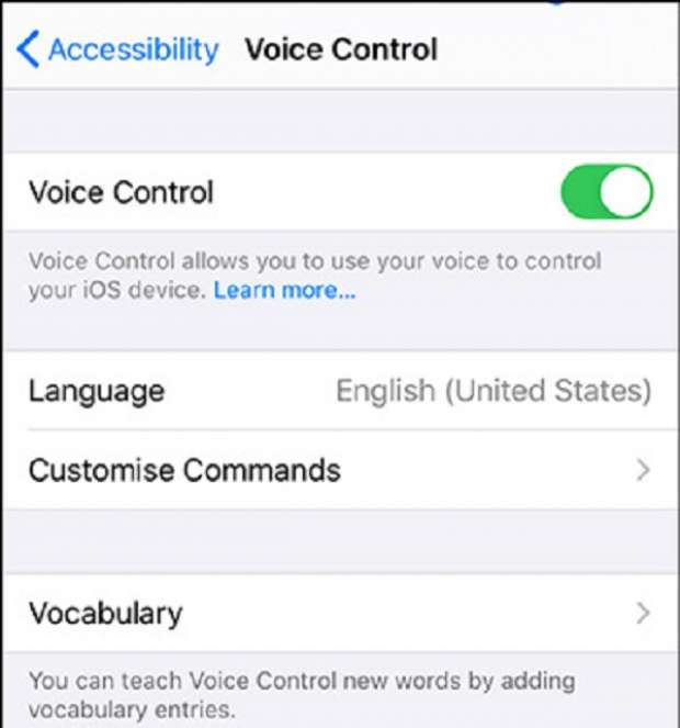 – انقر فوق التحكم الصوتي وقم بتشغيل VoiceOver.