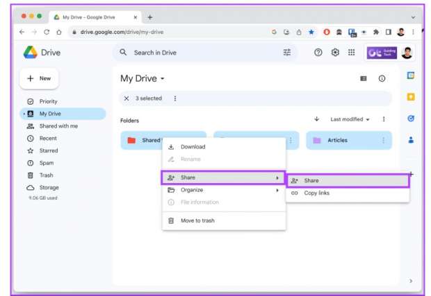 1- ميزة المشاركة لنقل Google Drive إلى حساب آخر