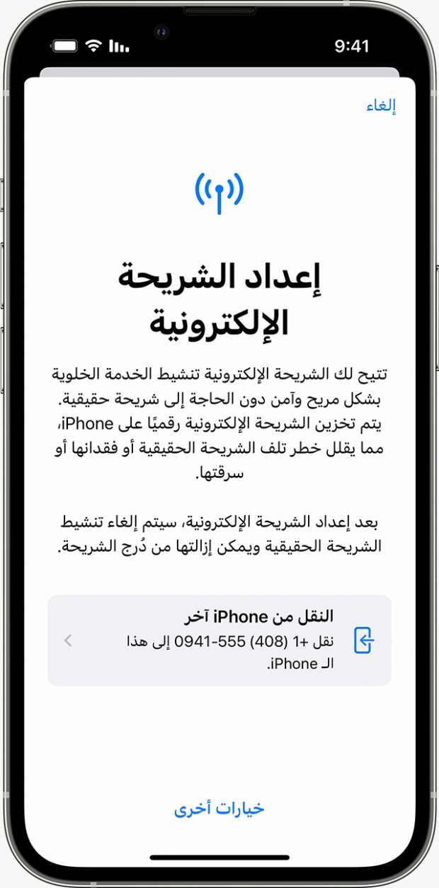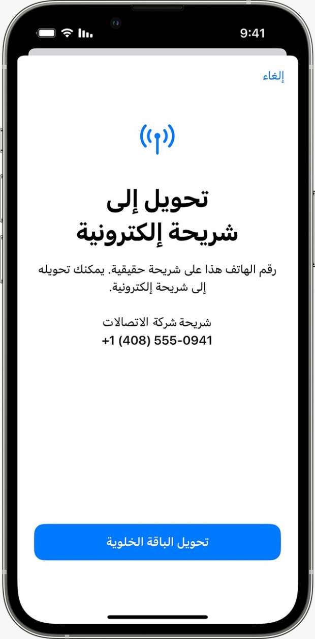 – اتصل بشركة الاتصالات لنقل رقم هاتفك من شريحة فعلية إلى شريحة إلكترونية باستخدام eSIM Carrier Activation (تفعيل شركة الاتصالات للشريحة الإلكترونية) أو عن طريق المسح الضوئي لرمز QR.