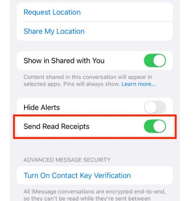 إذا كنت تستخدم جهاز iPhone، يمكنك تعطيل هذه الميزة في تطبيق «iMessage» وذلك عن طريق الانتقال إلى «الإعدادات، الرسائل، ثم أوقف تشغيل خيار «إرسال إشعارات القراءة».