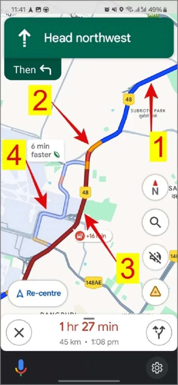 – الأحمر: يشير إلى التأخيرات المرورية، وكلما كان اللون الأحمر أغمق، كلما زادت كثافة حركة المرور التي ستواجهها على هذا الطريق.