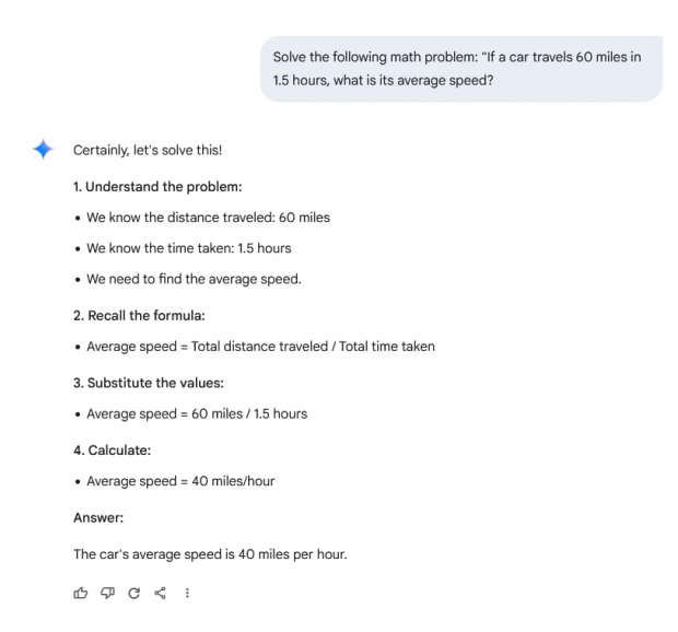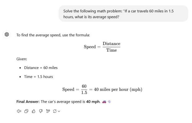 1- ChatGPT: إجابة صحيحة واستدل بالمعادلة أن (السرعة = المسافة / الزمن) مع تنسيق ممتاز للإجابة والمعادلة.