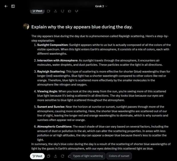 4- Grok: إجابة صحيحة وشرح واف لظاهرة تبعثر الضوء وعرفها بشكل صحيح باسم ظاهرة تشتت رايلي Rayleigh scattering.