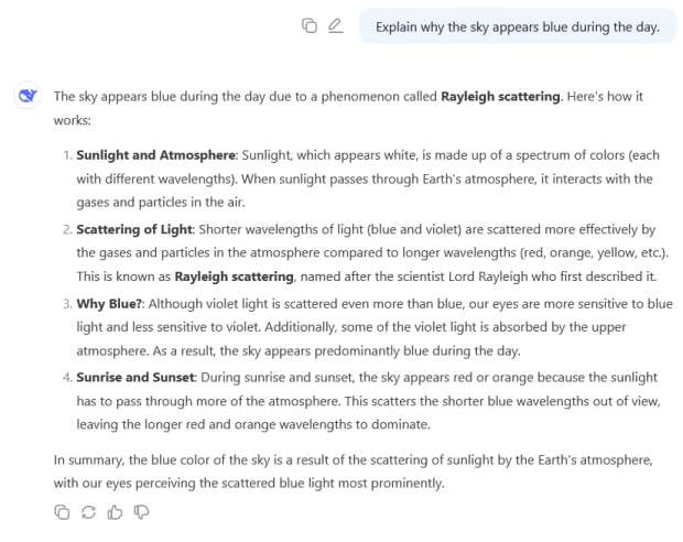 1- ChatGPT: إجابة صحيحة وشرح واف لظاهرة تبعثر الضوء وعرفها بشكل صحيح باسم ظاهرة تشتت رايلي Rayleigh scattering.