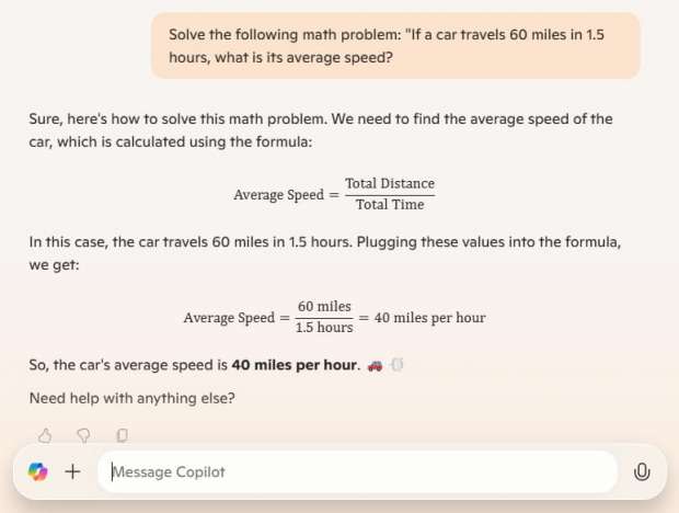 2- Copilot: إجابة صحيحة واستدل بالمعادلة أن (السرعة = المسافة / الزمن) مع تنسيق ممتاز للإجابة والمعادلة.