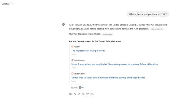 1- ChatGPT: قام بالبحث عبر الإنترنت لإيجاد إجابة السؤال، وهذا يعني أنه غير محدث ويستخدم الإنترنت في البحث عن الإجابات التي تتعلق بمتغيرات الأوضاع الحالية.