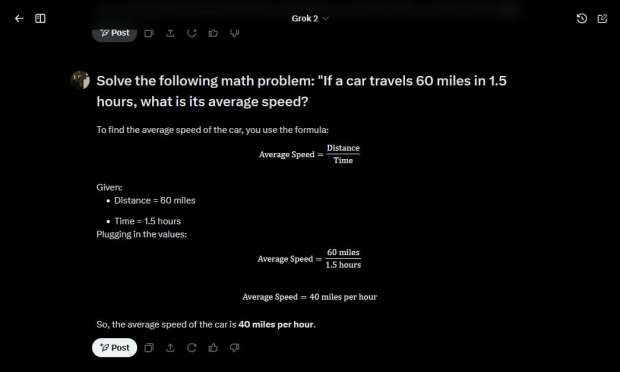 4- Grok: إجابة صحيحة واستدل بالمعادلة أن (السرعة = المسافة / الزمن) مع تنسيق ممتاز للإجابة والمعادلة.