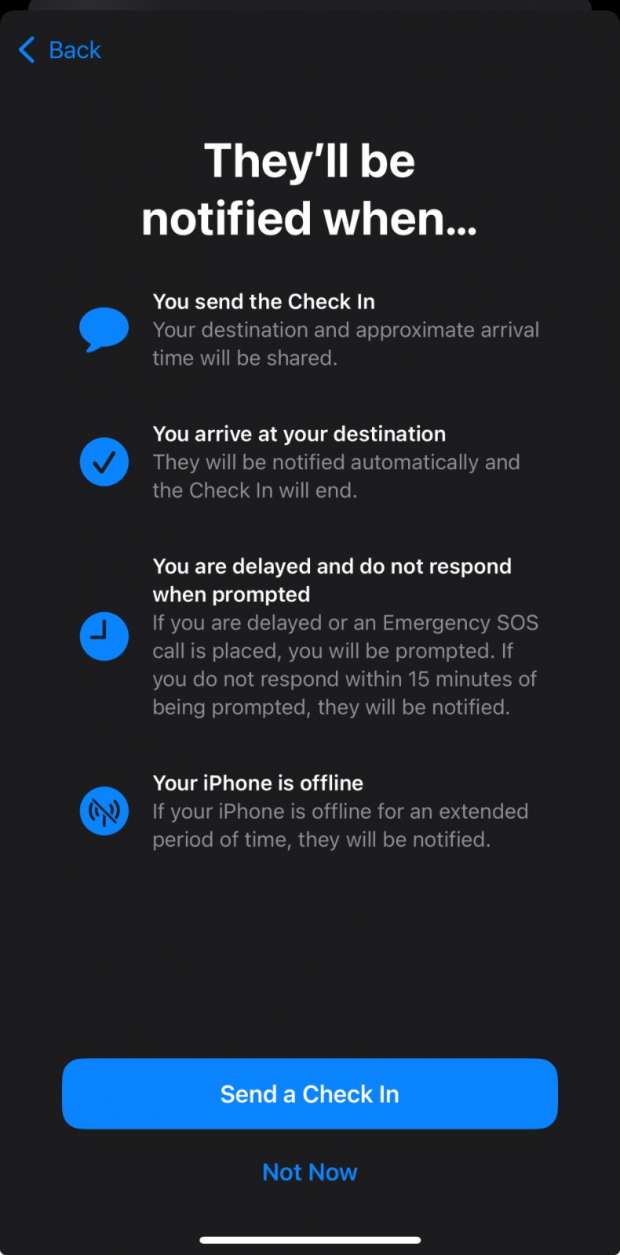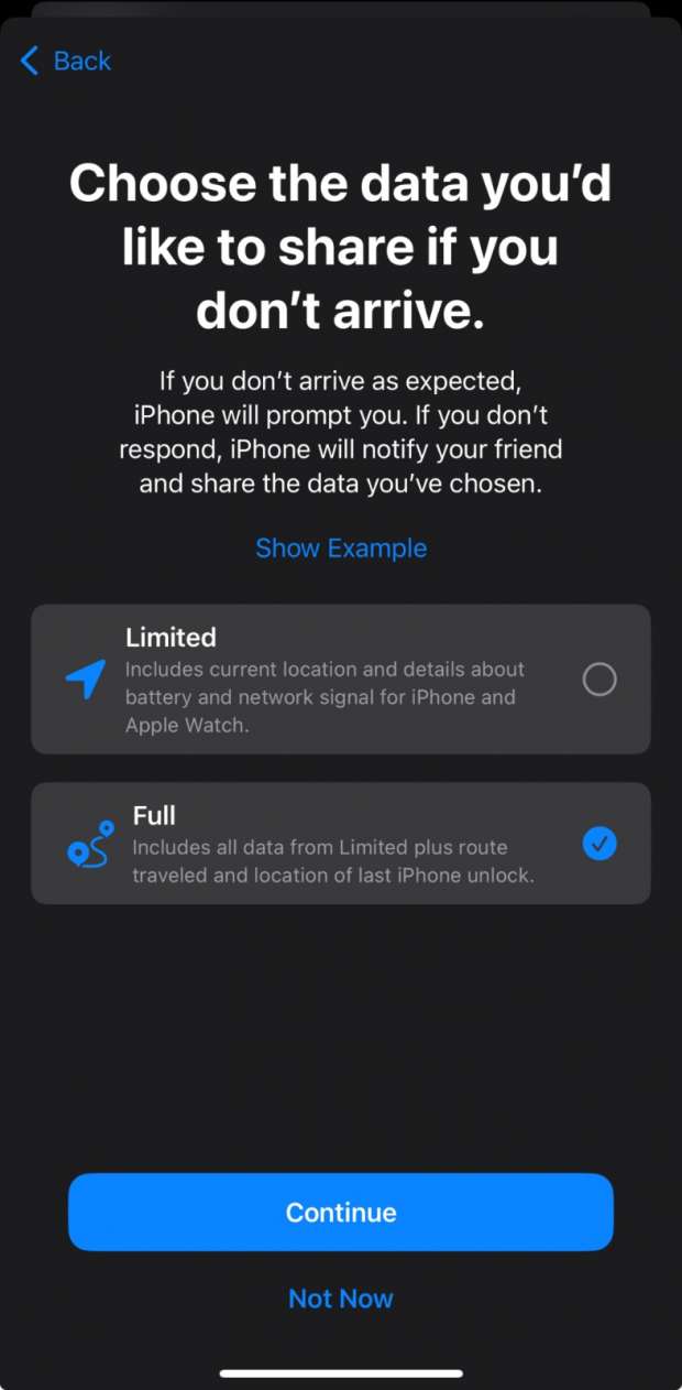 الميزة بمجرد تفعليها، ستقوم تلقائيًا بإخطار صديق بأن جهاز iPhone الخاص بك قد وصل إلى وجهة ما، وسيصبح بإمكانك اختيار التفاصيل التي يراها هذا الشخص، إذا تم إكمال عملية تسجيل الوصول بنجاح، بما في ذلك، موقعك ونسبة البطارية وإشارة الهاتف.