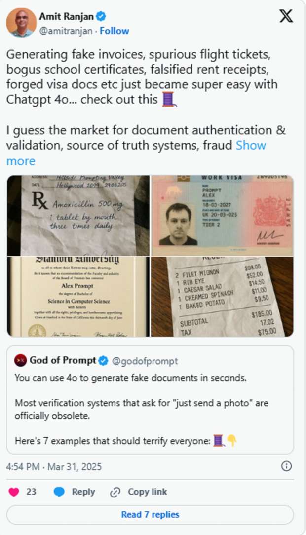 ووفقًا لموقع The Times of India، فقد برزت قضية تُشكك في حدود استخدام الذكاء الاصطناعي، إذ استخدم الباحث البولندي بوريس موسييلاك برنامج ChatGPT-4o لإنشاء جواز سفر مزيف في خمس دقائق فقط، وكانت الوثيقة المزيفة مقنعة لدرجة أنها استطاعت اختراق معظم الأنظمة الآلية بسهولة.