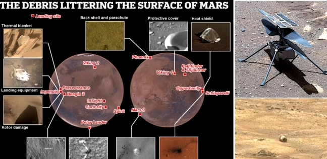 وتحت عنوان «البشر يدمرون كوكب المريخ» كشف موقع «دايلي ميل» البريطاني عن خريطة صادمة كشفت عن وجود 15694 رطلاً من النفايات الفضائية التي تراكمت على كوكب المريخ، والتي يأتي في مقدمتها المركبات الفضائية المحطمة.