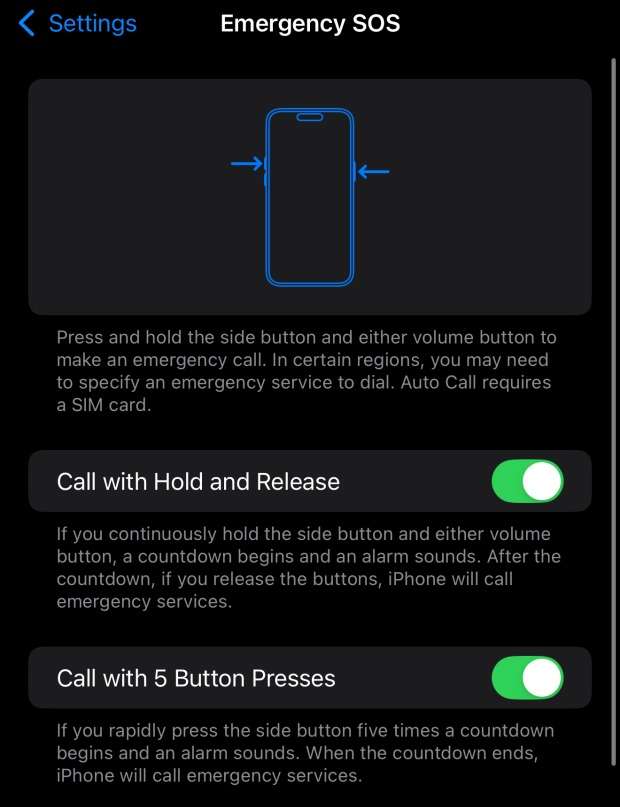 أما الحيلة الرابعة هي ميزة منفصلة تمامًا مرتبطة بخدمة Emergency SOS التي تقدمها Apple، وذلك من خلال الانتقال إلى الإعدادات ثم الضغط على SOS الطوارئ، ثم قم بتشغيل ميزة الاتصال بخمسة ضغطات على الأزرار، وعندما تضغط بسرعة على الزر الجانبي خمس مرات، سيؤدي ذلك إلى تشغيل استجابة SOS الطارئة على جهاز iPhone الخاص بك، وسيؤدي هذا إلى بدء العد التنازلي وسيصدر صوت تنبيه، وبمجرد انتهاء العد التنازلي، سيقوم جهاز iPhone الخاص بك تلقائيًا بالاتصال بخدمات الطوارئ.