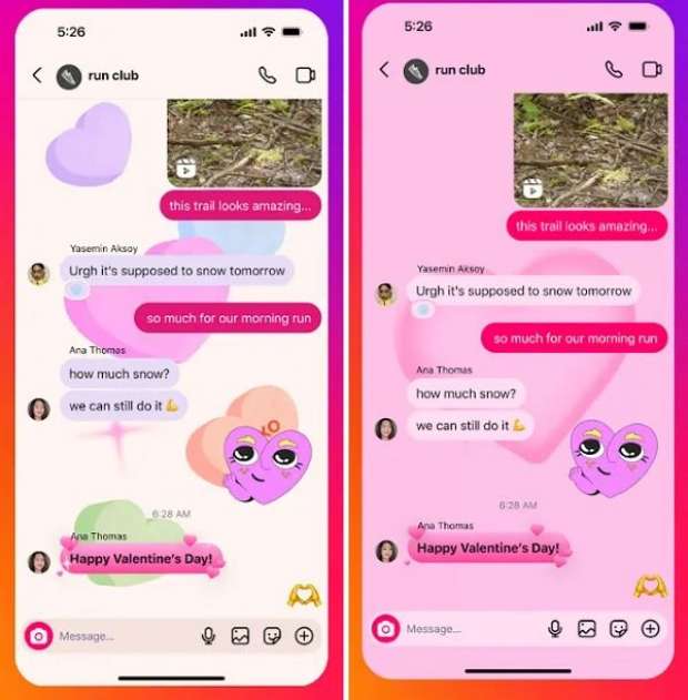 وبحسب موقع «socialmediatoday» التقني، فإن تطبيق Instagram سيضيف بعض التأثيرات الجديدة للملاحظات، والتي سيتم عرضها على أي ملاحظة تتضمن مصطلحات محددة مرتبطة بعيد الحب، بما في ذلك «vday» و«ily» و«pookie»، كما سيضيف Instagram أيضًا خطوطًا وتأثيرات نصية ذات طابع خاص، بما في ذلك عرض مخصص عند وضع علامات على الأصدقاء في القصص، بجانب بعض موضوعات الدردشة الجديدة لهذه المناسبة.