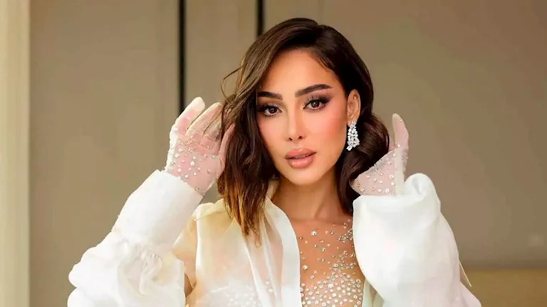 وزينت بسمة إطلالتها بمجوهرات ماسية مكونة من كوليه وخاتم وأسورة، من تصميم معرض مجوهرات “ذهبة”.
