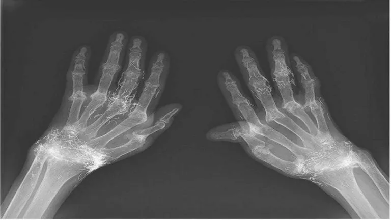 وأظهرت صور الأشعة السينية وجود سماكة وتصلب في الجزء الداخلي من قصبة الساق ونمو عظمي في الركبة، وهي علامات شائعة لهشاشة العظام. إلا أن المفاجأة كانت في اكتشاف مئات من الخيوط الذهبية الدقيقة المزروعة داخل الأنسجة المحيطة بالمفصل.