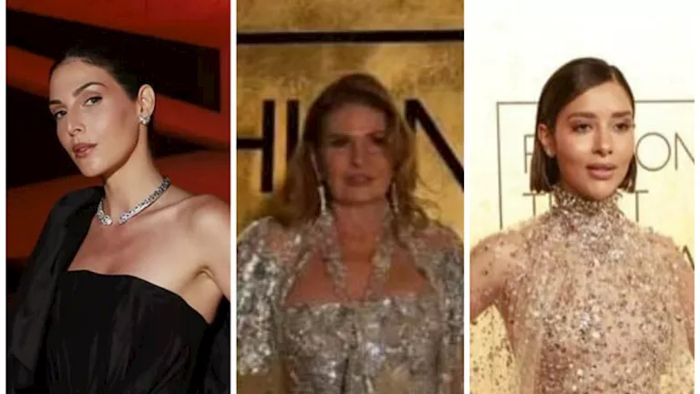 ظهرت الفنانة يسرا بفستان ذهبي طويل من توقيع زهير مراد، تميز بتطريزات لامعة وأكمام طويلة شفافة أضفت لمسة من الرقي.