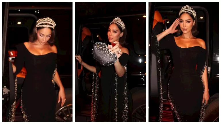 أكملت إطلالتها بتاج لامع على شعرها المنسدل بشكل ناعم، وحقيبة صغيرة متناسقة مع الفستان، ما أضفى عليها هالة ملكية متكاملة.