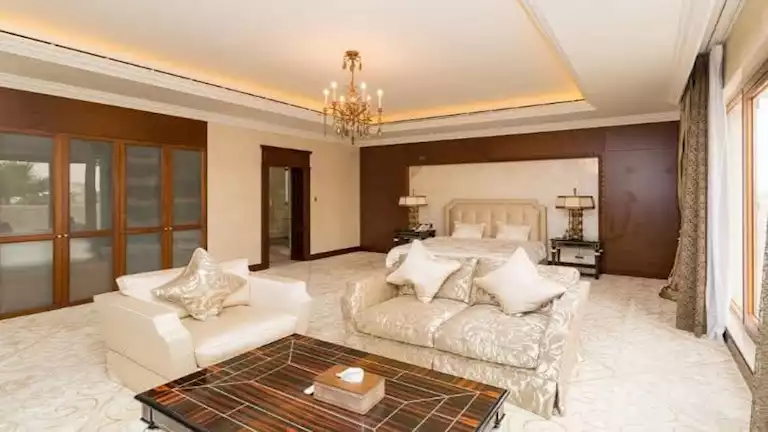 كما يتميز القصر بتصميم معماري فخم، ويضم خمس غرف نوم فاخرة، وقبتين شاهقتين، ومسبحين داخلي وخارجي، وحوض أسماك مرجانية ضخم.