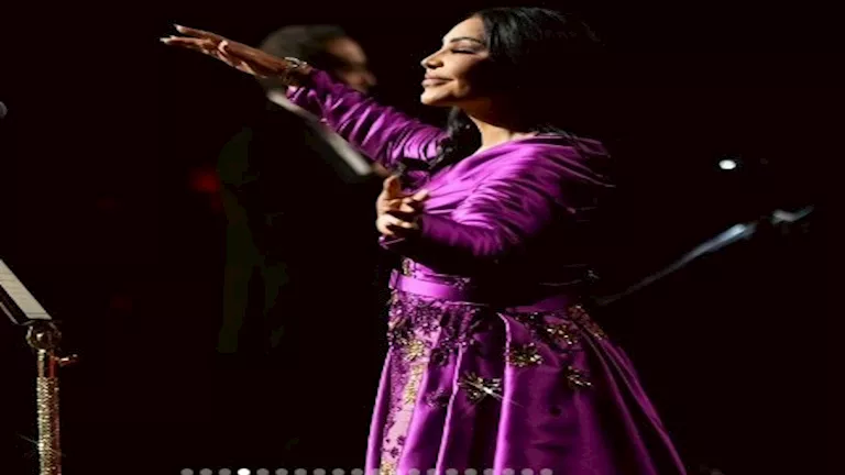 وتألقت أحلام على المسرح بفستان باللون البنفسجي الملكي، جاء بتصميم أنيق يجمع بين الفخامة والجرأة.