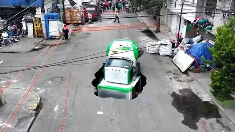 سقطت شاحنة محملة بزجاجات صودا في حفرة أرضية ضخمة بمنطقة إزتابالابا، أكثر أحياء مكسيكو سيتي كثافة سكانية، في حادث أثار استغراب السكان.