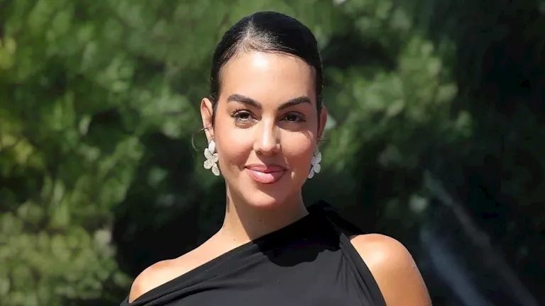 وزينت جورجينا إطلالتها بمجوهرات ماسية مكونة من خاتم وأسورة ونظارة شمسية باللون الأسود وساعة يد.