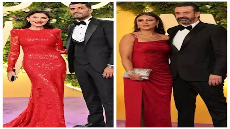 أما زوجته ارتدت فستانا بقصة الكب باللون الأحمر، واعتمدت مكياجا ناعما، وتركت شعرها منسدلا.