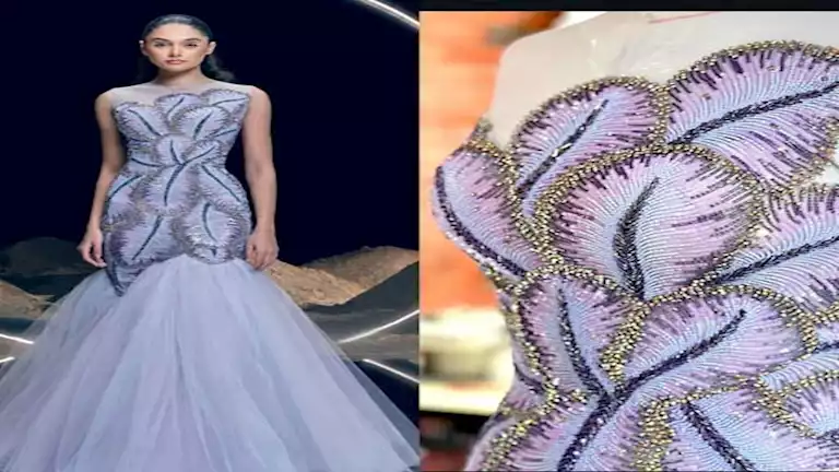 وبحسب ما وضحت دار أزياء رامي قادي لـ مصراوي، الفستان مصنوع يدوياً بالكامل، ومستوحى من عصور قديمة بتصميم حورية البحر، يتميز بتزيينات دقيقة على شكل بتلات مزينة بالخرز والترتر والكريستالات اللامعة.