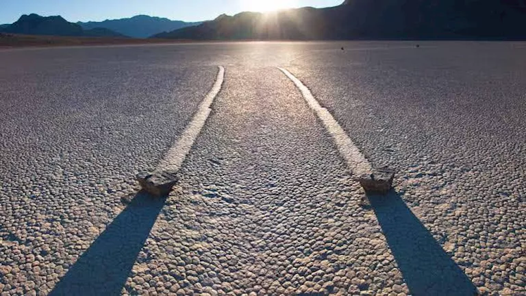 هذه الصخور، التي يصل وزن بعضها إلى مئات الكيلوجرامات، تتحرك لمسافات طويلة على أرض مسطحة، مخلّفة وراءها خطوطًا طويلة في الرمال الطينية. والغريب أن حركتها تحدث في صمت تام، دون أن يراها أحد تتحرك فعليًا.