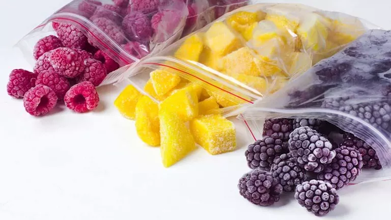 قطّعي الفواكه إلى شرائح أو مكعبات صغيرة، وضعيها على صينية مبطّنة بورق زبدة داخل الفريزر لمدة ساعة، ثم انقليها إلى أكياس محكمة الغلق.