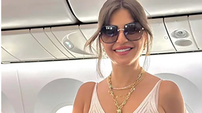 أطلت منة ببلوزة قصيرة (Crop Top) باللون الأبيض وتنورة قصيرة باللون البيج الفاتح تتميز بفتحة جانبية تضيف لمسة من الأناقة.