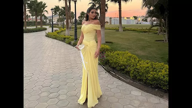أطلت ملك مرتدية فستان طويل بقصة “الأوف شولدر” باللون الأصفر، تميز بأنه بقصة انسيابية على الجسم.